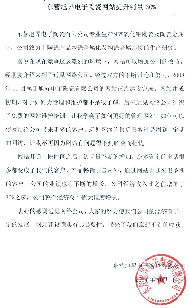 據(jù)說在現(xiàn)在競爭這么激烈的環(huán)境下,網(wǎng)站可以增加公司的效益,經(jīng)朋友介紹來到了遠見網(wǎng)絡(luò)公司。經(jīng)過雙方的不斷討論和努力,2008年1山月屬于旭昇電子陶瓷有限公司的網(wǎng)站正式建設(shè)完成。網(wǎng)站建成初期,對于如何為管理和維護都不是很了解,后來遠見網(wǎng)絡(luò)公司組織了免費的網(wǎng)站維護培訓,讓我學會了如何更好的管理網(wǎng)站、如何可以使網(wǎng)站給公司帶來更多的客戶。遠見網(wǎng)絡(luò)的售后服務很是周到,定期的回訪,讓我不再因為網(wǎng)站有問題得不到解決而擔憂。