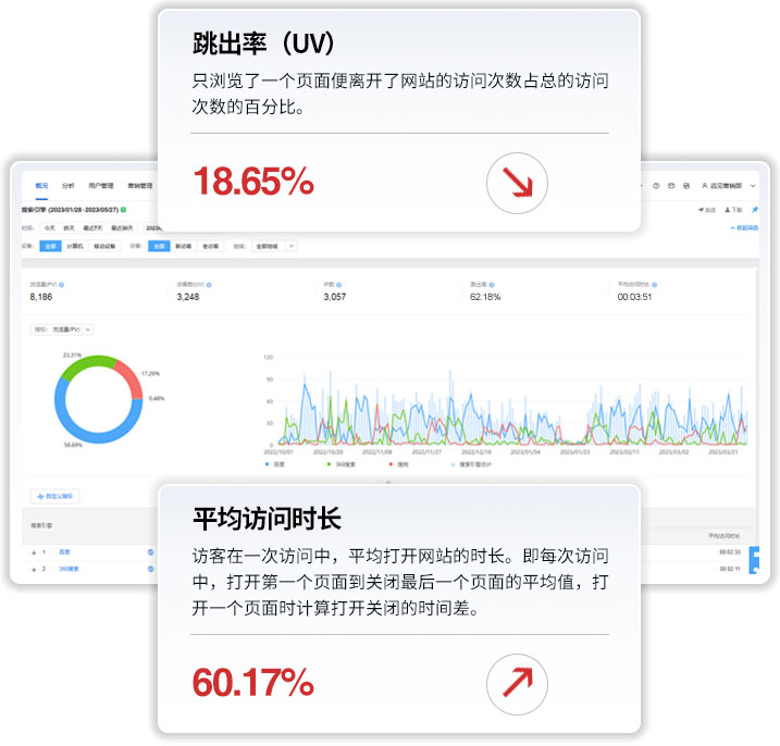 網(wǎng)站跳出率和平均訪問時長可以反映出網(wǎng)站推廣關(guān)鍵詞的選擇是否精準,文案的撰寫是否優(yōu)秀,著陸頁的設計是否符合用戶體驗